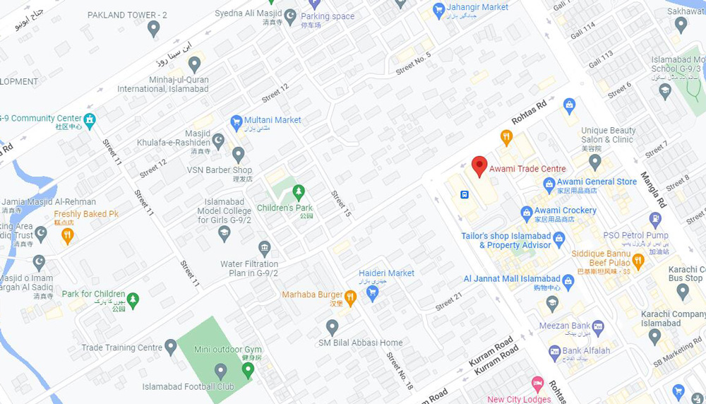Endereço: Office no. 7A, 1st Floor, Chand Plaza opposite Awami Trade Centre, G-9 Markaz, Islamabad