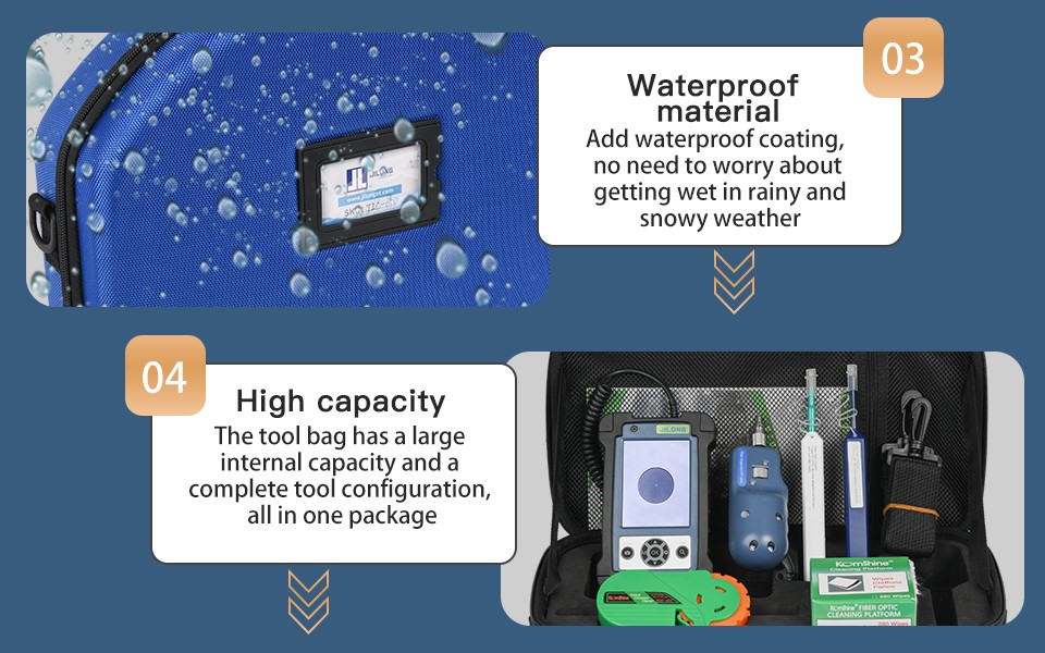 O kit JIC-05D é feito de EVA, à prova d'água e resistente ao desgaste, com revestimento à prova d'água na camada externa, e não há necessidade de se preocupar com a umidade e não se preocupar com a água. Não só isso, mas o aspirador de fibra interna está totalmente configurado e não precisa mais correr para escolher um aspirador de fibra.
