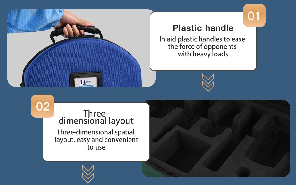 Ele aproveita ao máximo as vantagens do layout 3D, permitindo que a ferramenta de posicionamento fácil seja vista de relance; Ao mesmo tempo, a esponja de alta densidade é usada para abrir o molde com precisão, moldagem primária, design de separação, ferramentas de fixação completa, ferramentas de proteção contra colisões e não é fácil de perder.